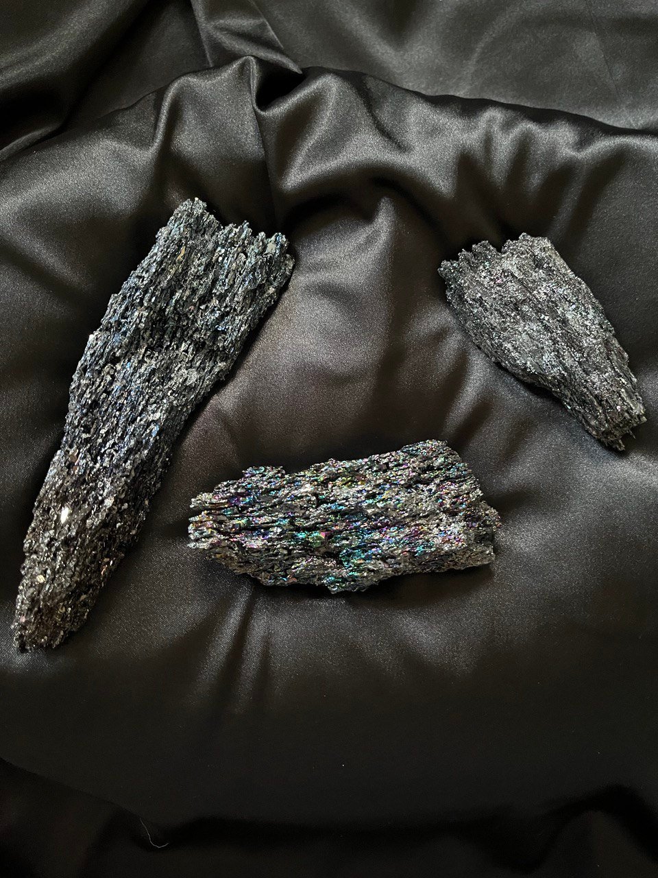 A very hard mineral made of silicon carbide (9 on the Mohs hardness scale, just one step below diamond) that is a by-product of zinc smelting and is used as an industrial strength abrasive. Carborundum form these gorgeous, glittery splays of dark gray crystals that sparkle in a rainbow of colors. Pictures don't do them justice at all! Pick your favorite from the options below: